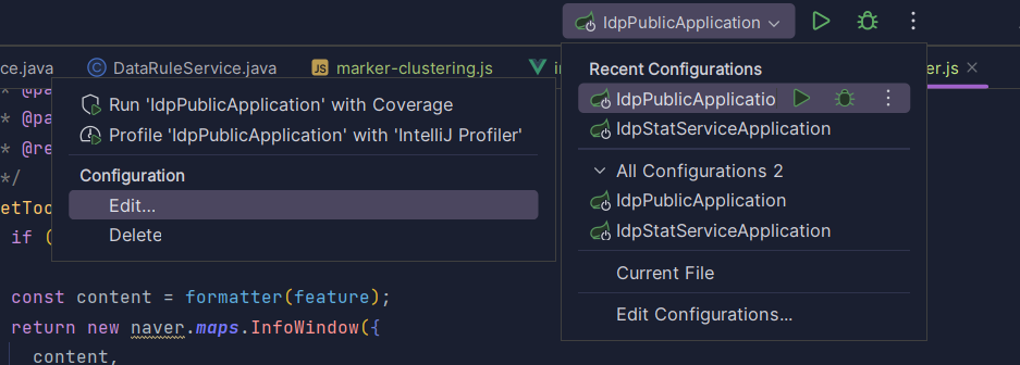 - 오른쪽 상단 콤보박스 > 실행 Application 확인 > Configuration Edit > Modify Options > Working directory > portal/parent/myDitectory 수정