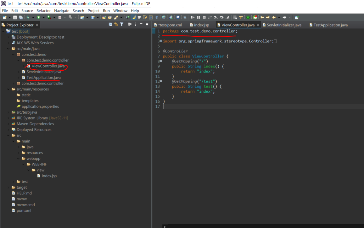 - 이프로젝트의 경우 TestApplication.java가 com.test.demo패키지에 존재함으로 아래와같이 파일을 만들었다